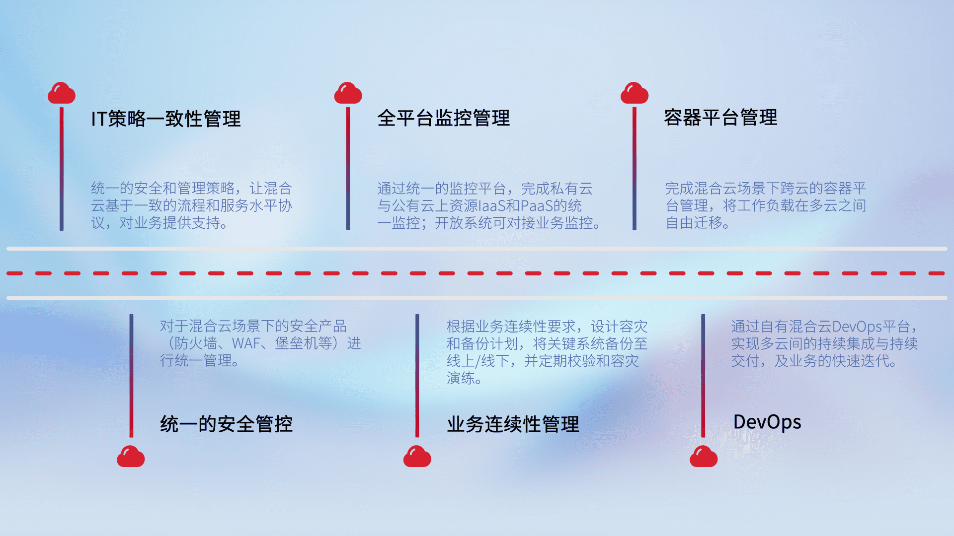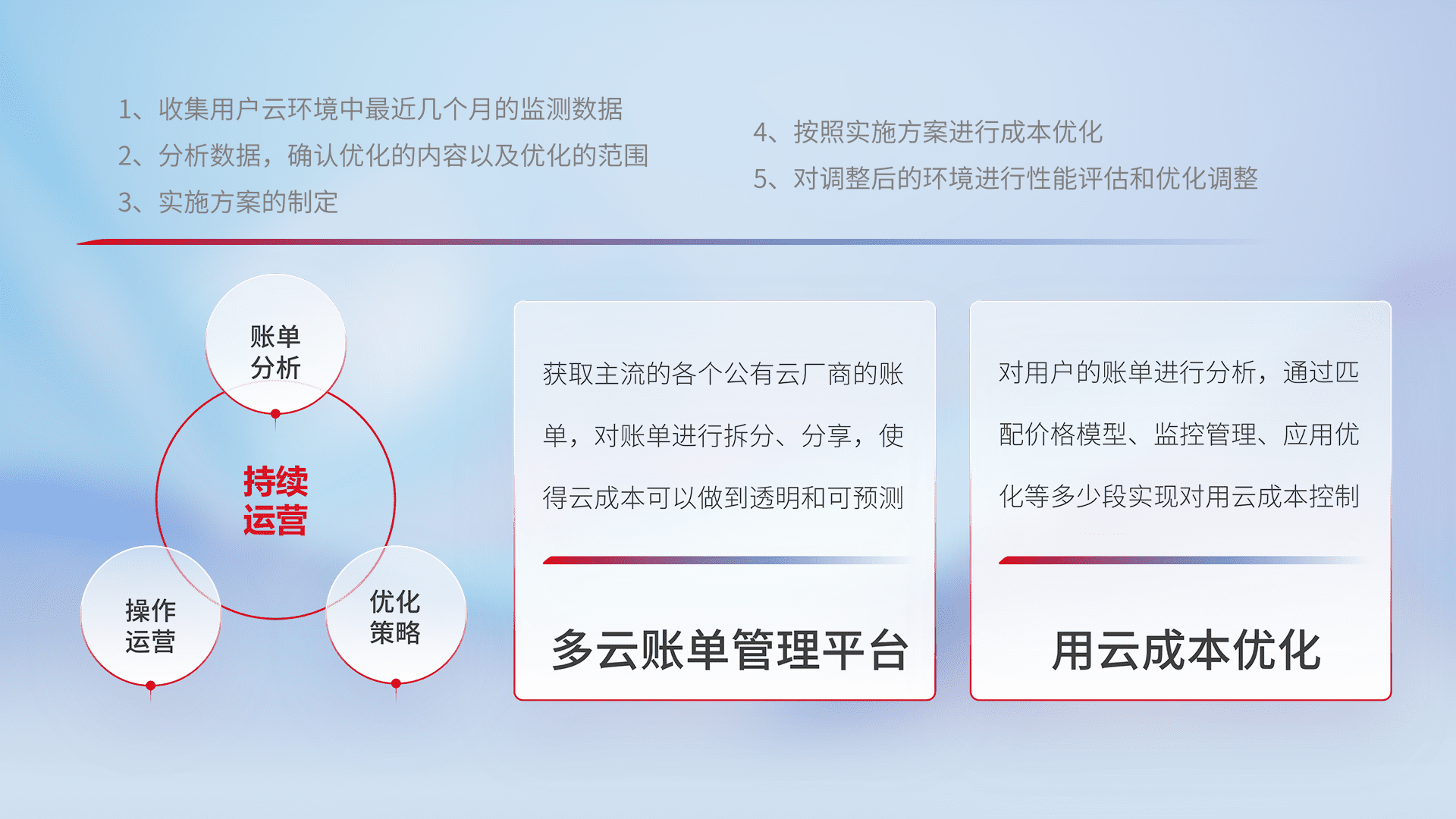 通过多云纳管,,以统一的资源数据模型把客户的云资源进行抽象和封装,,,,进而实现对多云资源的统一操作,,保障云资源管理的可靠性、、稳定性与可用性。。量身定制化运维内容,,配置、、、开发运维、、、、补丁管理、、备份、、监控、、、、认证和访问管理、、审计和日常巡检等,,,保障在用云过程中的可靠度,,稳定度以及高可用率。。。