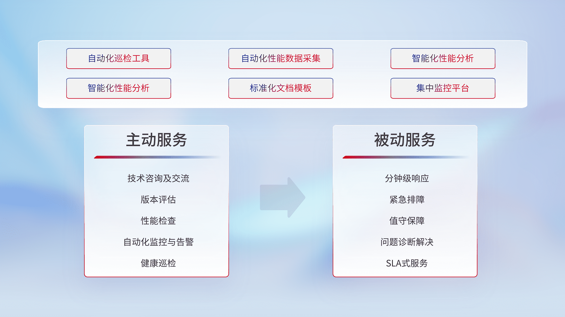 智能化工具和标准化文档,,,,保障服务质量,,提供主动服务(包含技术咨询、、版本评估、、、、性能检查、、自动化监控与告警、、健康巡检)和被动服务包含(分钟级响应、、、、紧急排障、、、值守保障、、、问题诊断解决、、、SLA服务)。。。